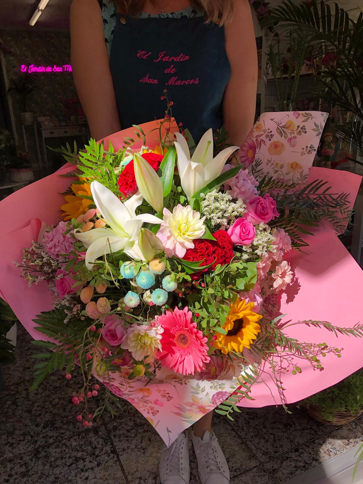 Bouquet formado por flires de temporada de múltiples variedades y tonalidades varias que con elb acompañamiento de verdes veriados hacen una composición fresca y alegre