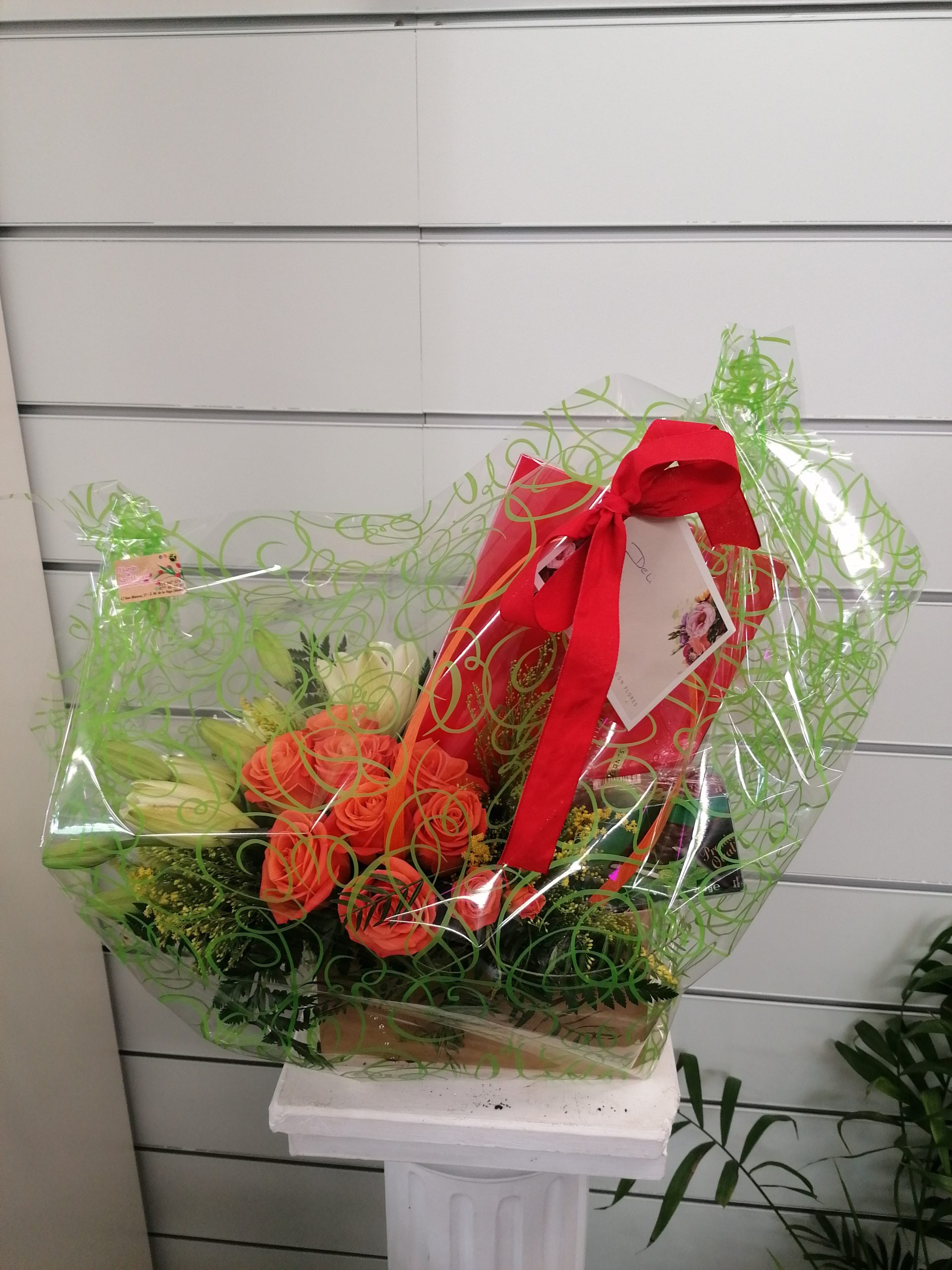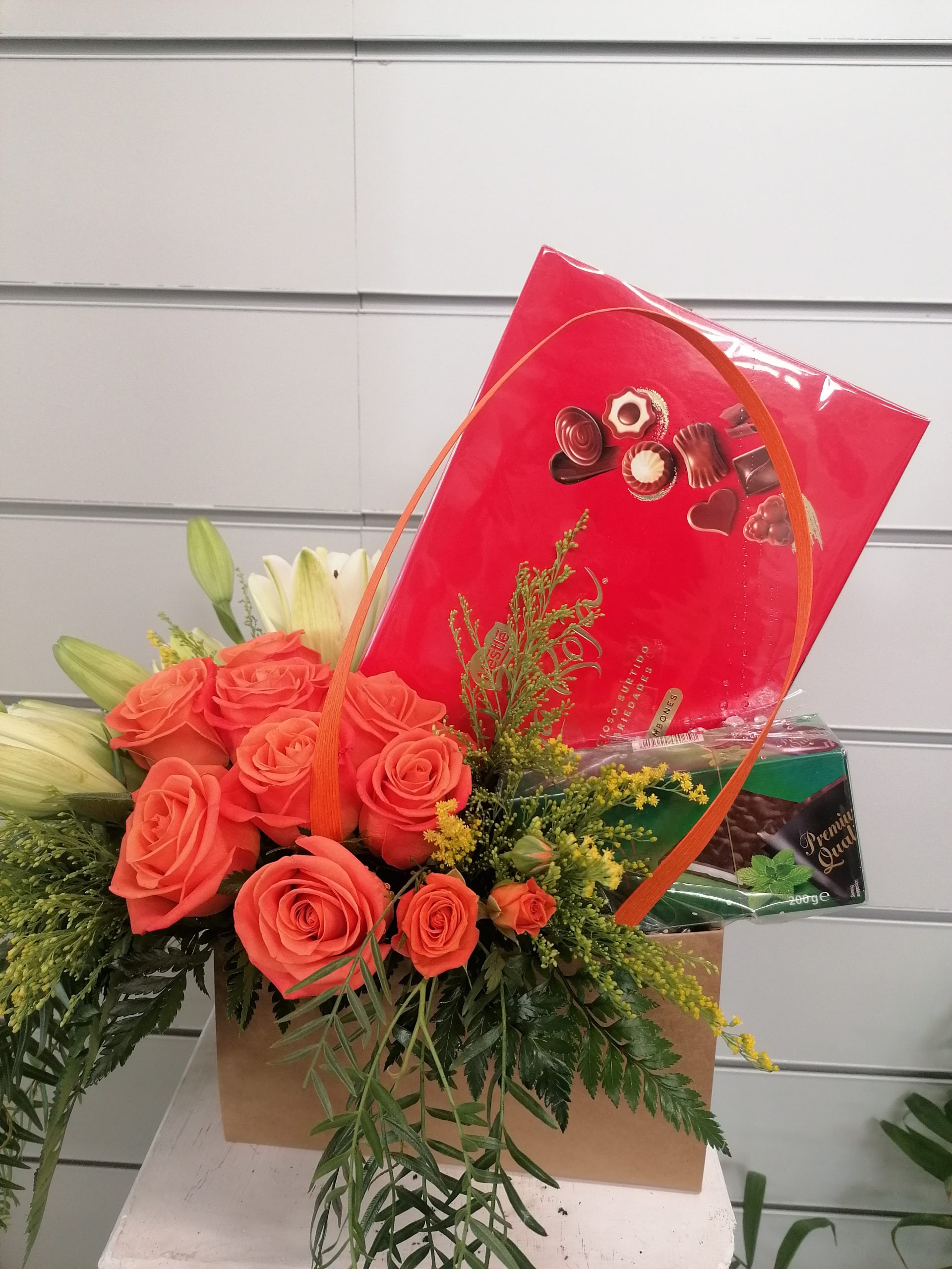 Cayetana. Arreglo floral con rosas, liliums con complemento de bombones