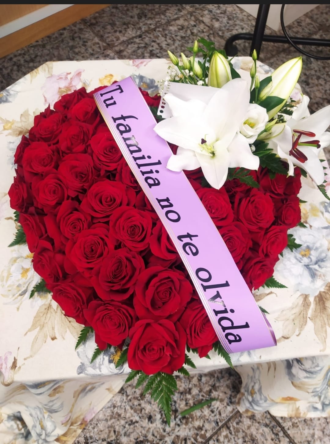 Corazón Funerario de rosas rojas con montaje lateral de flor variada
