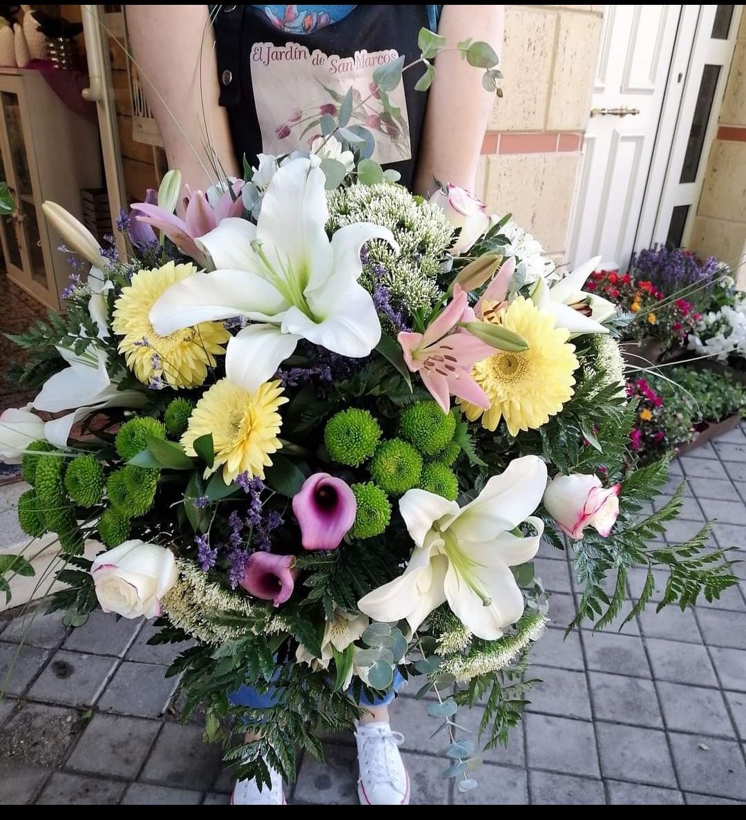 Arreglo floral compuesto por gerberas, liliums, calas, margarita de botón, rosas y verdes variados