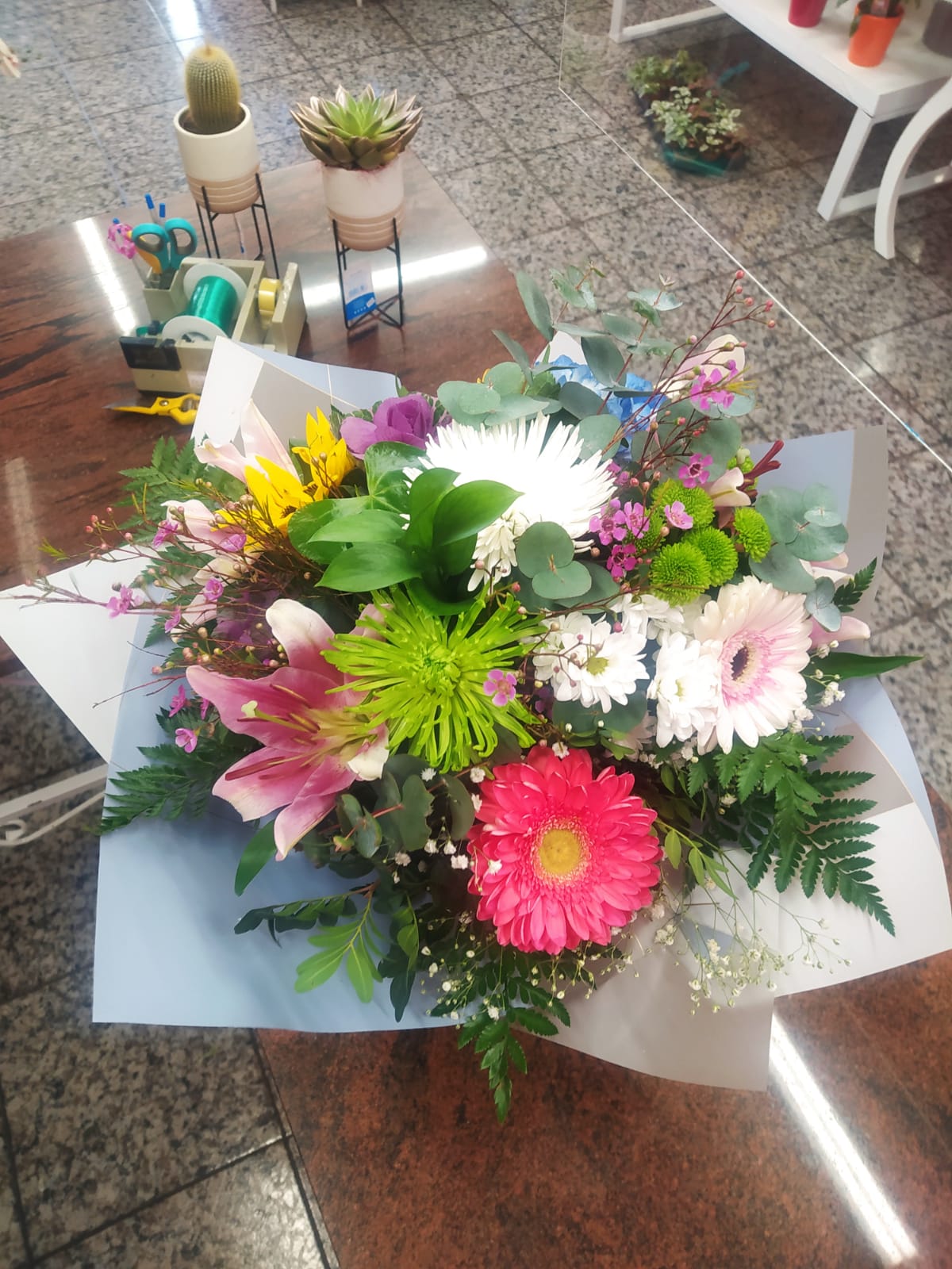 Ramo flor variada tonos rosas y verdes con flor de temporada