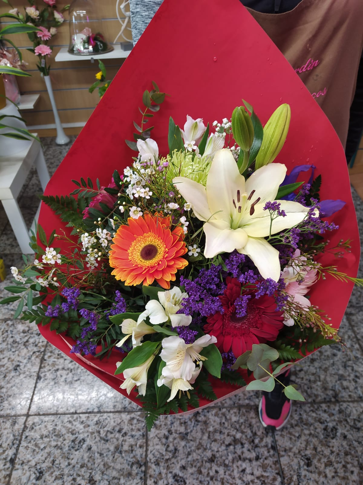 Ramo flor variada. M liliums, gerberas. Astromerias con rellenos tonos morados
