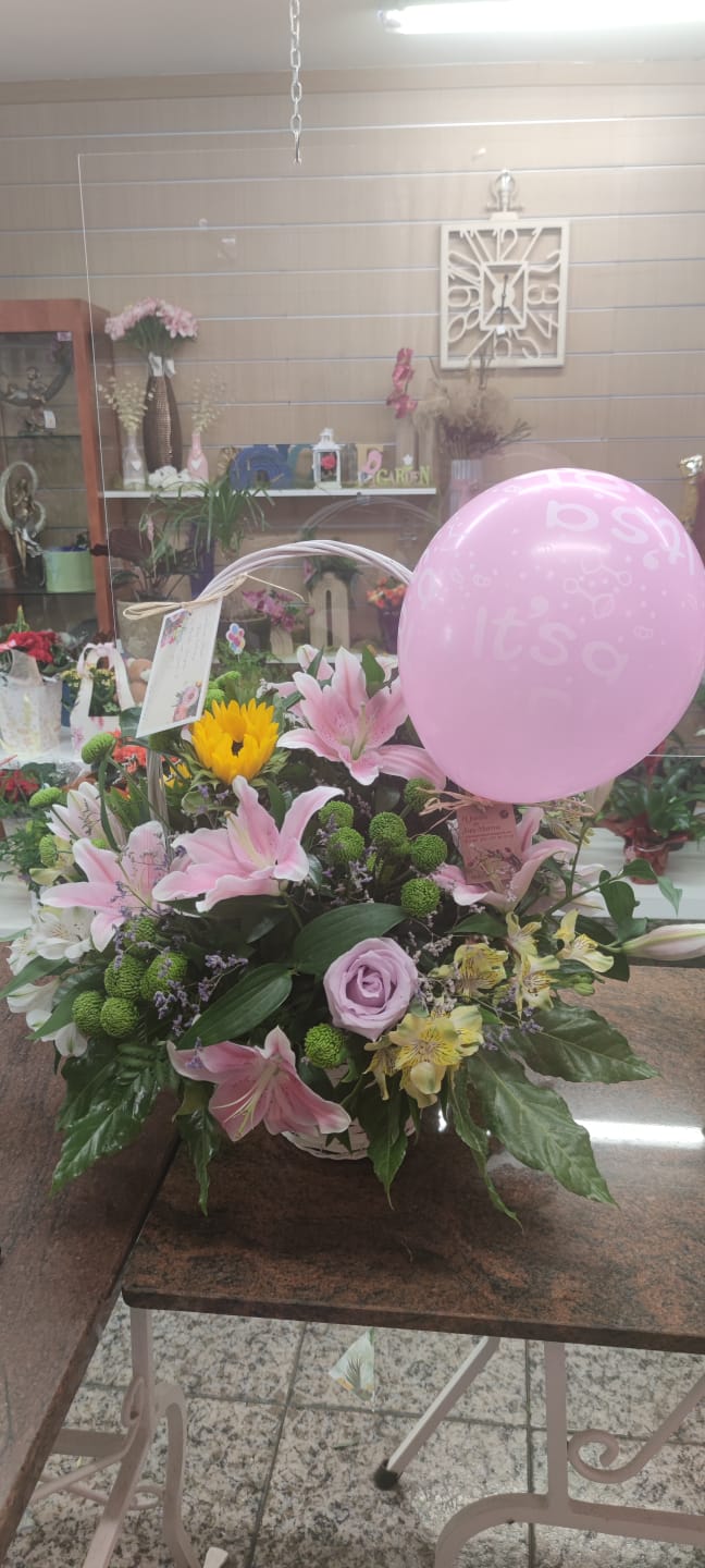 Elegante Cesta floral compuesta por liliums, rosa, astromelias, gerbera, margarita de botón acompañada de verdes variados y complementando el arreglo globo de niñ@