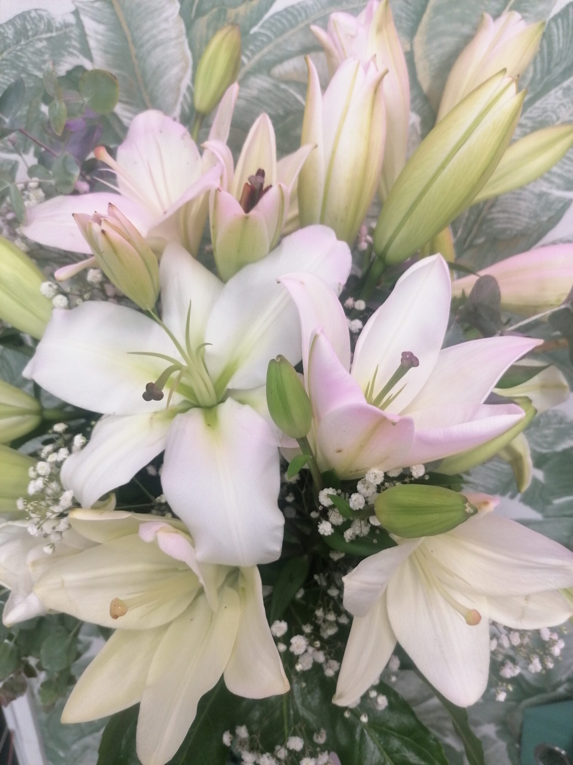 Bouquet de liliums blanco con verdes variados conjunto floral que transmite delicadeza con peluche de nacimiento ideal para que tanto la mamá como el bebé tengan un bonito regalo de nuestra parte (jarrón no incluido) (el color del peluche se puede especificar pudiendo ser rosa, azul o neutro) (el modelo del peluche puede cambiar respetándose siempre peluches de la misma calidad e importe)