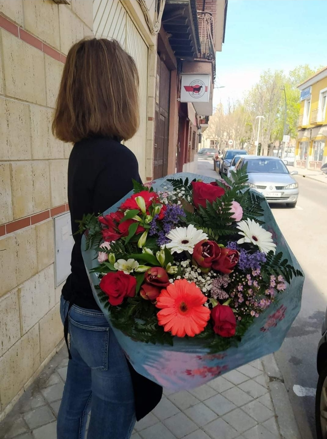 Ramo variado con predominio del color rojo, incluye rosas rijas