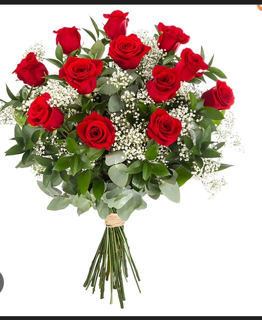 Ramo de 12 rosas rojas de tallo largo acompañadas de verdes variados