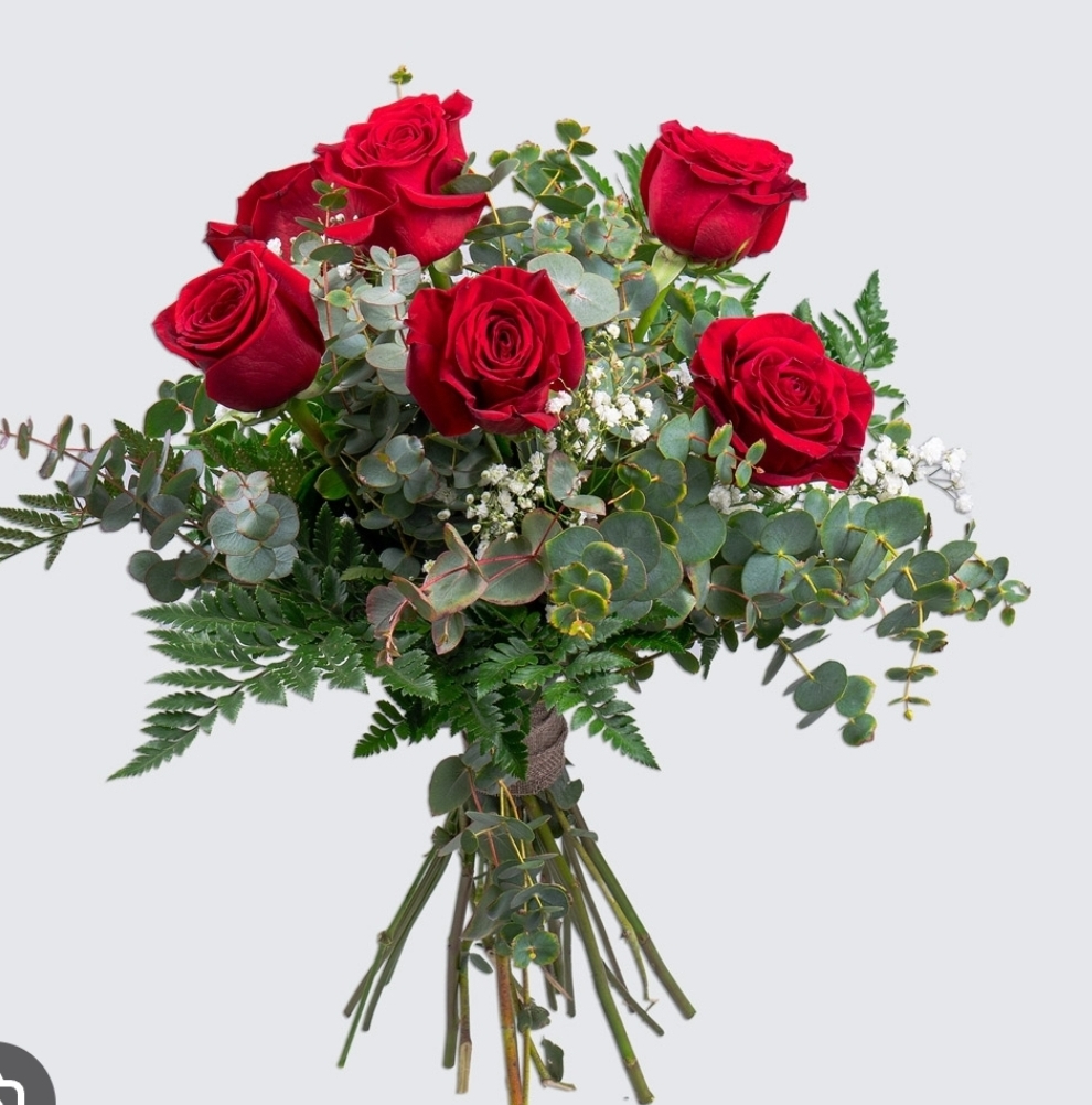 Ramo de 6 rosas de tallo largo acompañadas de verdes variados