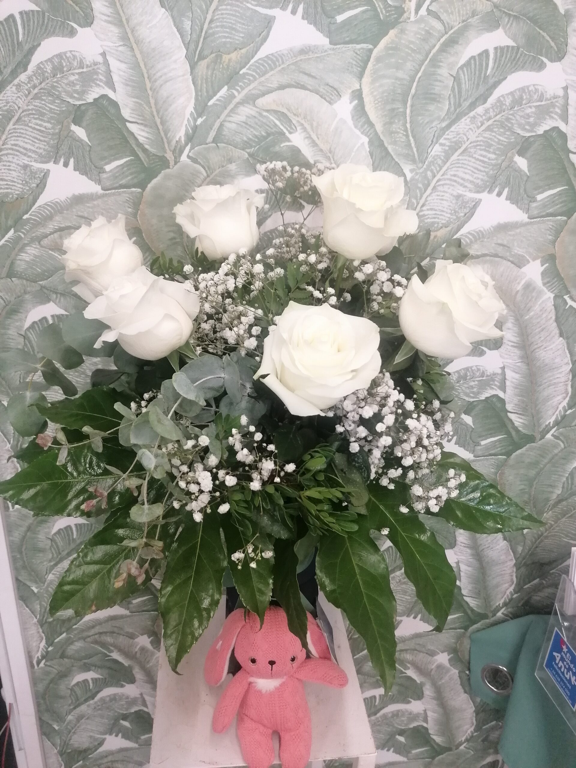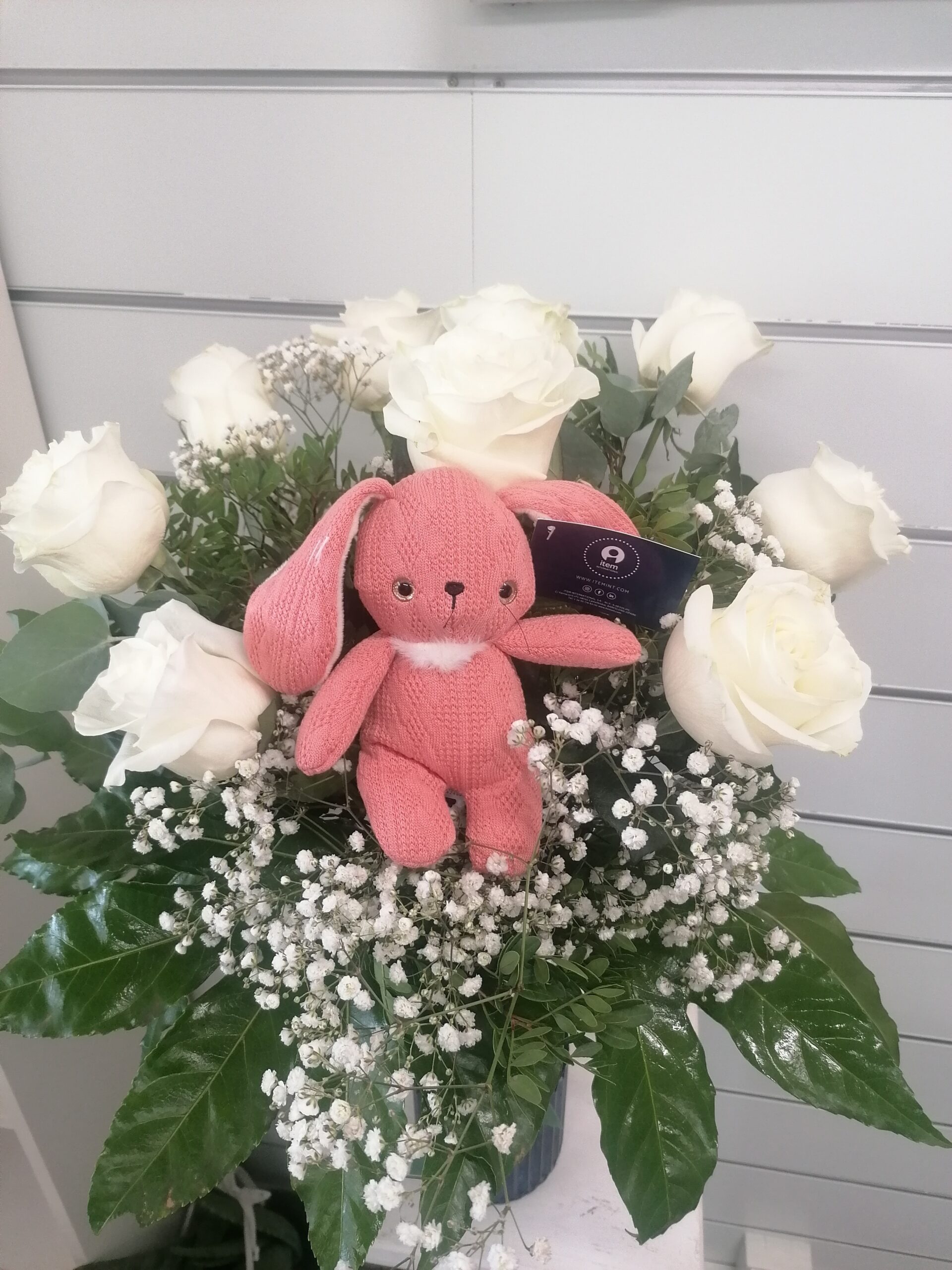 Ramo de 1 doc de rosas con paniculata y verdes variados, acompañado con un peluche ideal para que tanto la mamá como el bebé disfruten con nuestro regalo, ( el modelo del peluche estará sujeto a existencias del momento, respetando siempre peluche de igual importe al de la foto, pudiéndose especificar el color rosa, azul o neutro)