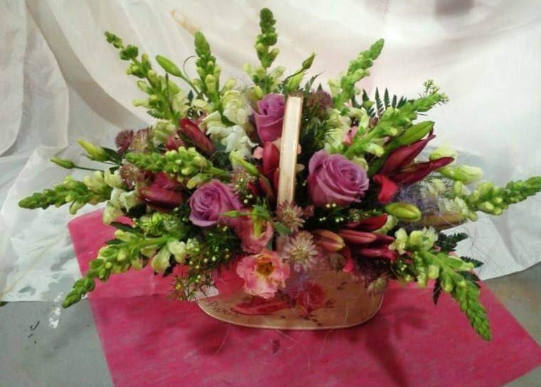 Zoe. Arreglo floral con rosas, dragonaria y flor de acompañamiento (la base puede cambiar en función de las existencias del momento)